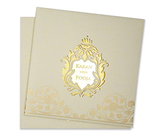 This is a beautiful ivory coloured card with some gold detailing and ribbed texture on the base. The envelope has a beautiful gold design at the bottom center. The card top had the same design laser cut reflecting gold and with a reflective surface in the surface to house the names of the bride and groom. There is a beautiful gold floral design at the bottom. It comes with two ivory inserts for the text. The card is thick and sturdy. The minimalistic design and colour gives it a royal appeal. This is a multifaith indian wedding invitation as no religious symbol is pre printed on it.